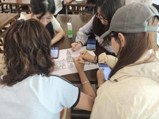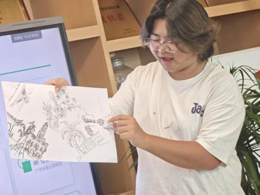 在宣传实践委员王钰文组织的“手绘校史墙”环节,35名同学分为8组,围绕“海纳百川”“扬帆起航”等主题创作绘画,并拼接成长卷进行展示。紧接着的“速写接力”环节更是将气氛推向高潮,同学们在长卷上接力作画,以笔传情,生动诠释了对学校的深厚情怀与发展愿景,展现了艺术学子将专业特长融入学校发展建设的思考。