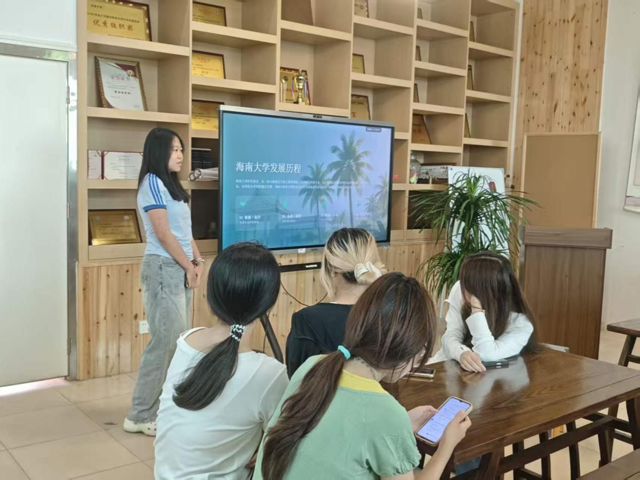 班会伊始,在心理文体委员裴斐的讲解中,同学们共同回顾了学校从1958年华南热带农业大学的创建、1983年海南大学的成立,2007年两校合并组建新海南大学,再到入选国家“双一流”建设高校的发展历程。
