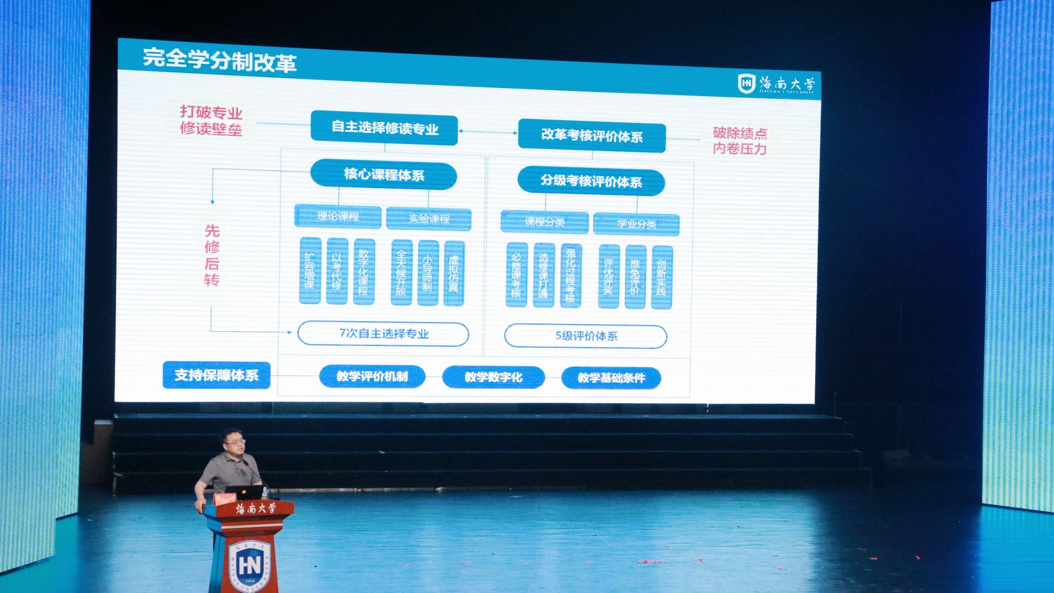 刘谦副校长为海德书院2025级本科新生讲授以“为教育强国、教育强省建设贡献青春力量”为主题的思政课。刘校长围绕顺应海南自贸港发展潮流、满足学生个性化发展需求两大方向,并结合自身经历及见闻,从“学校发展总体情况、综合改革、教育数字化”三个方面,重点论述了如何为教育强国、教育强省建设贡献青春力量。