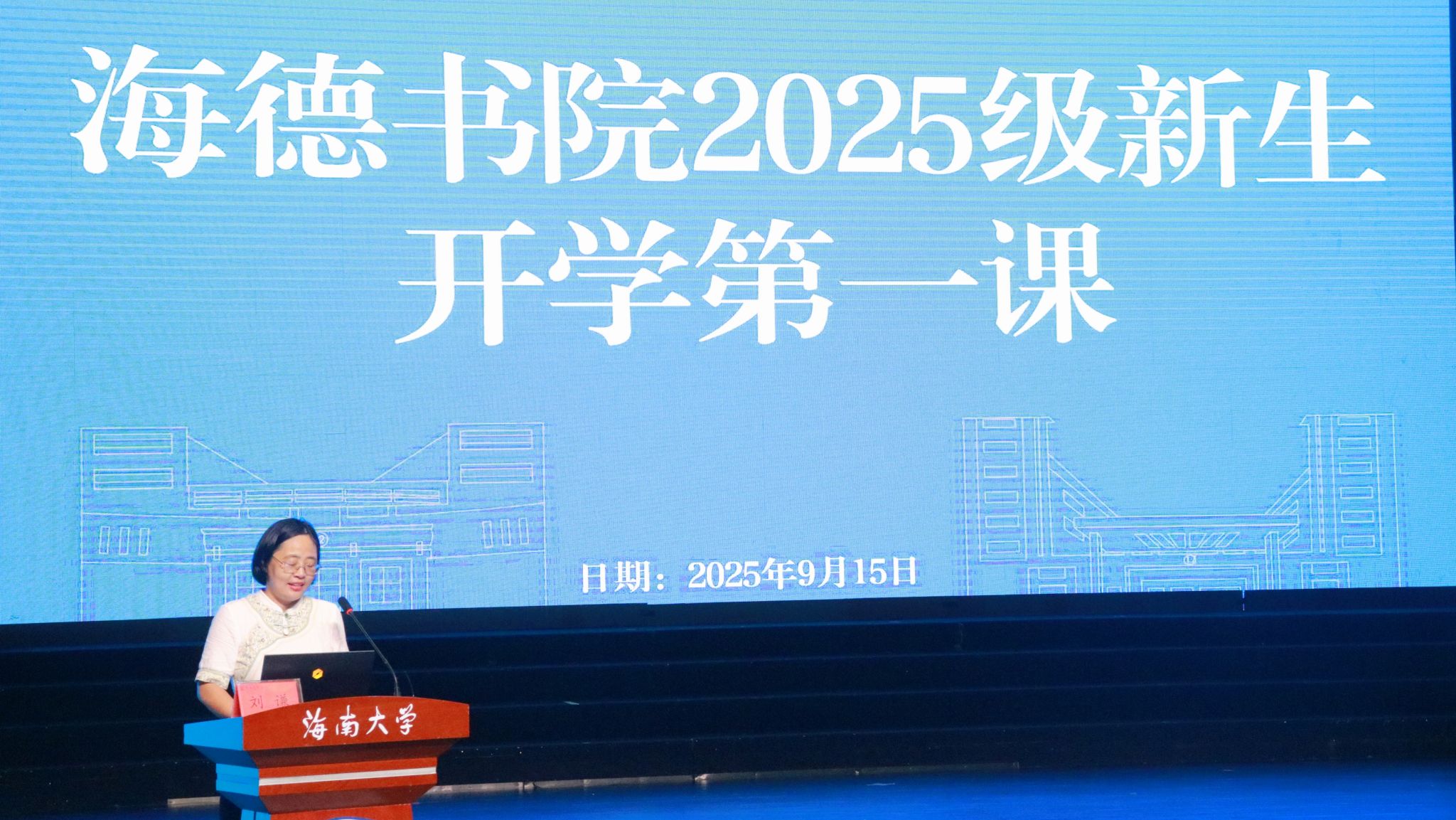 9月15日下午,海南大学海德书院在思源大礼堂举行2025级本科新生开学第一课活动,海南大学副校长、海德书院院长刘谦为新生们讲授了一堂精彩的思政课。此次活动由海德书院党委书记韩胜丁主持,书院全体辅导员以及2025级全体本科新生共同参加。