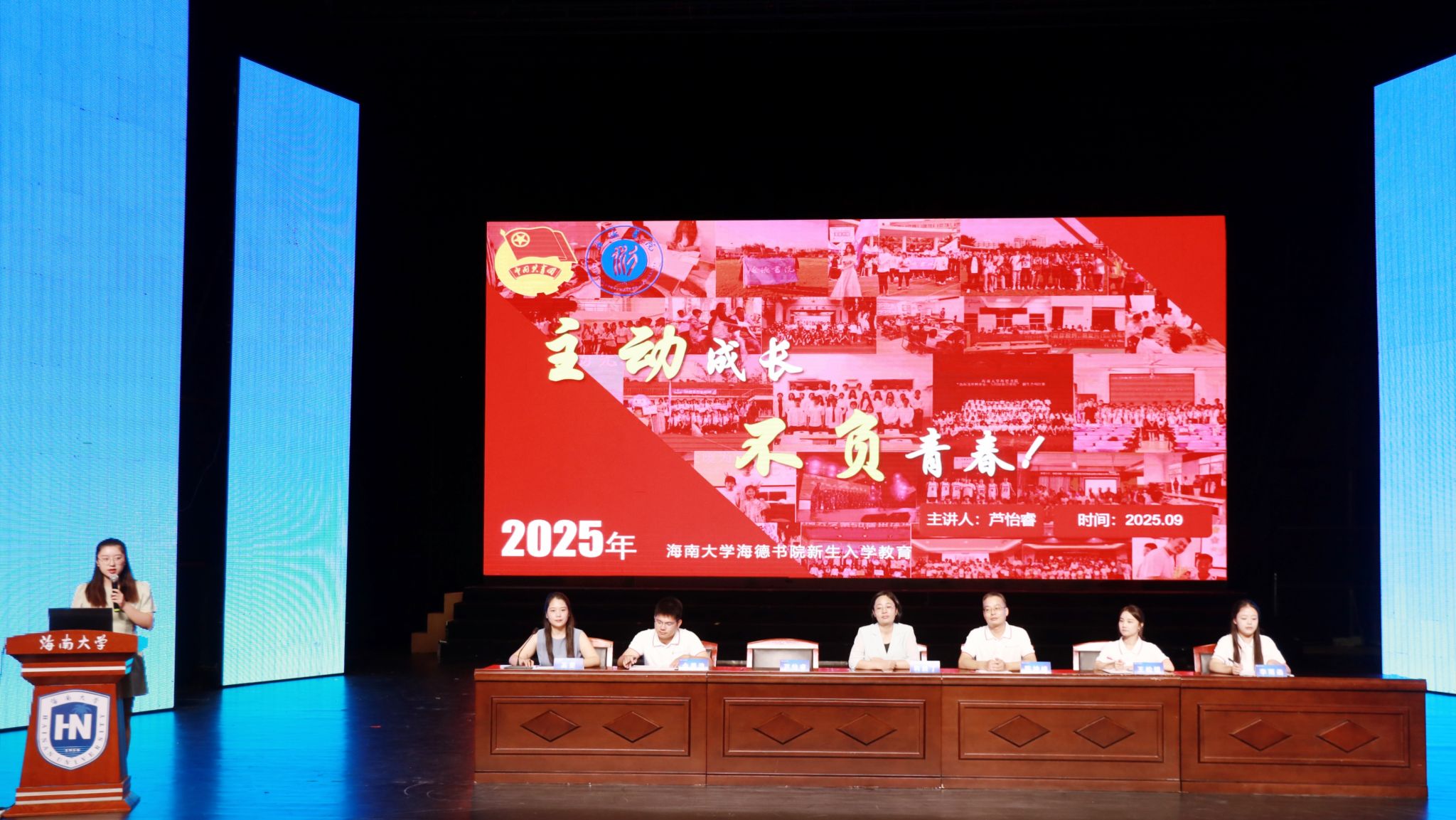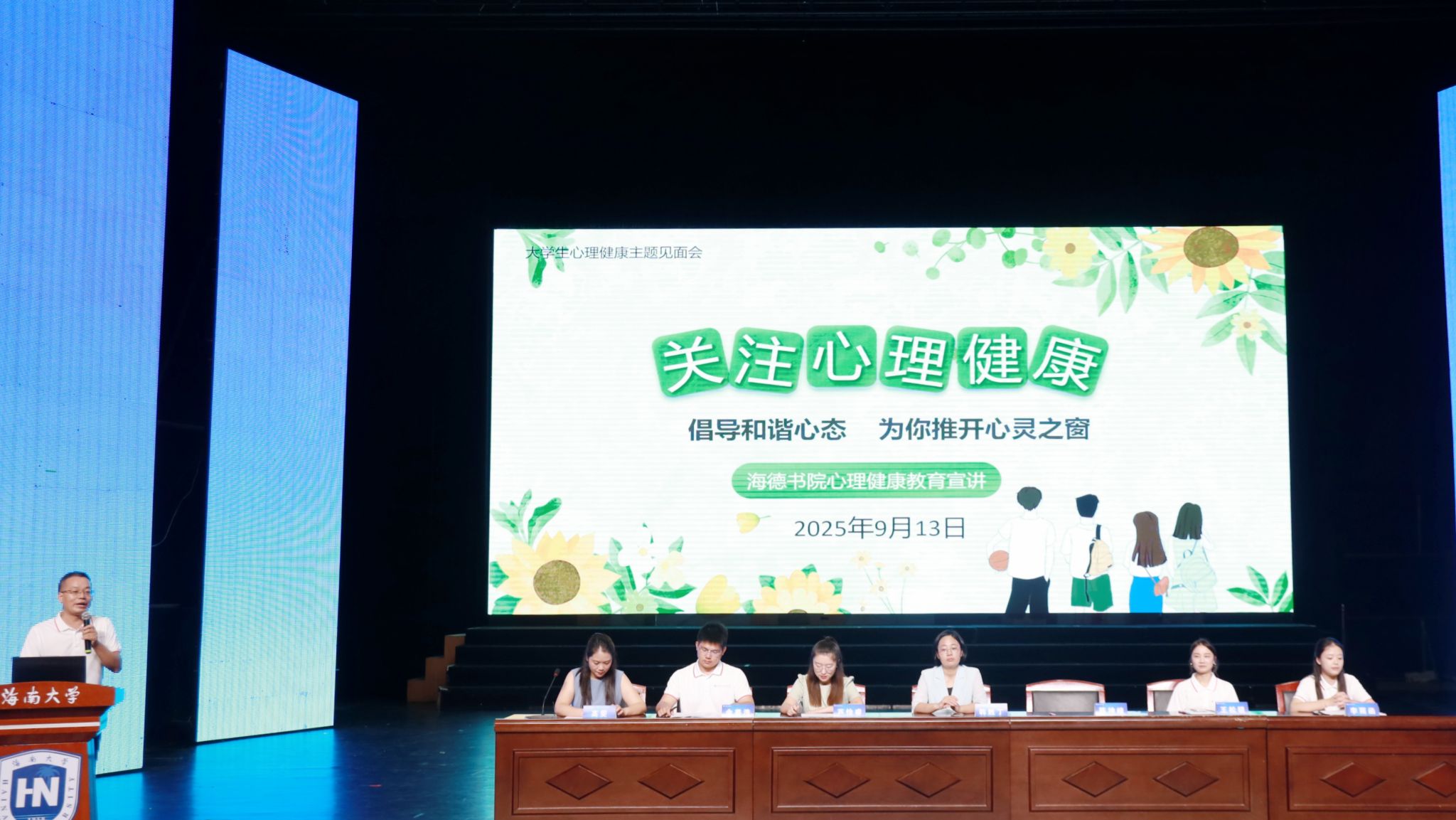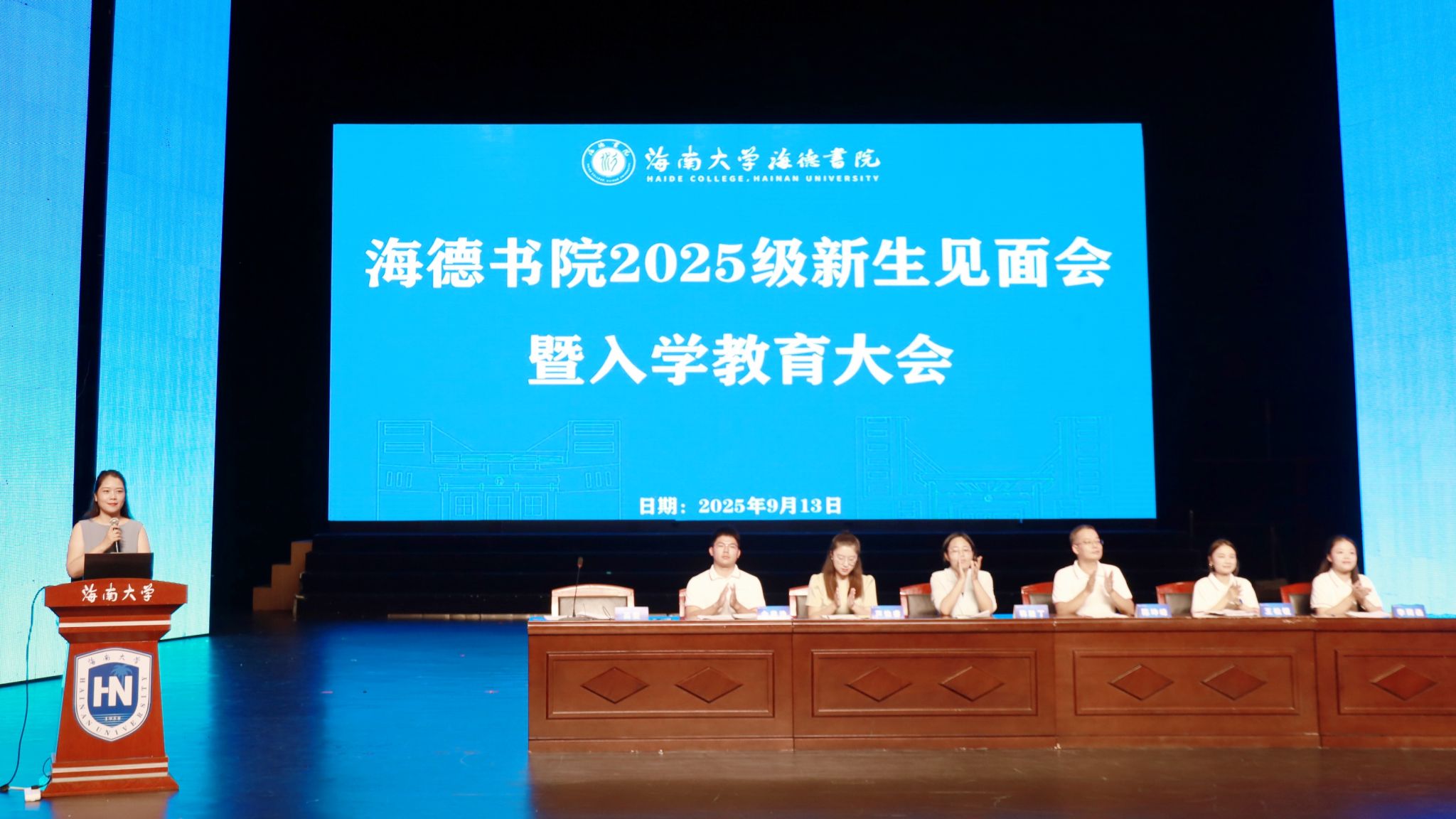 9月13日晚,海南大学海德书院2025级新生见面会暨入学教育大会在思源大礼堂成功举行。会议旨在帮助新生快速适应校园、明确发展方向,完成入校衔接工作。海德书院党委书记韩胜丁,书院辅导员高雯、陈坤峰、芦怡睿、王松锐、余姜浩、李雨函,以及2025级本、硕、博全体新生共同参加本次会议。