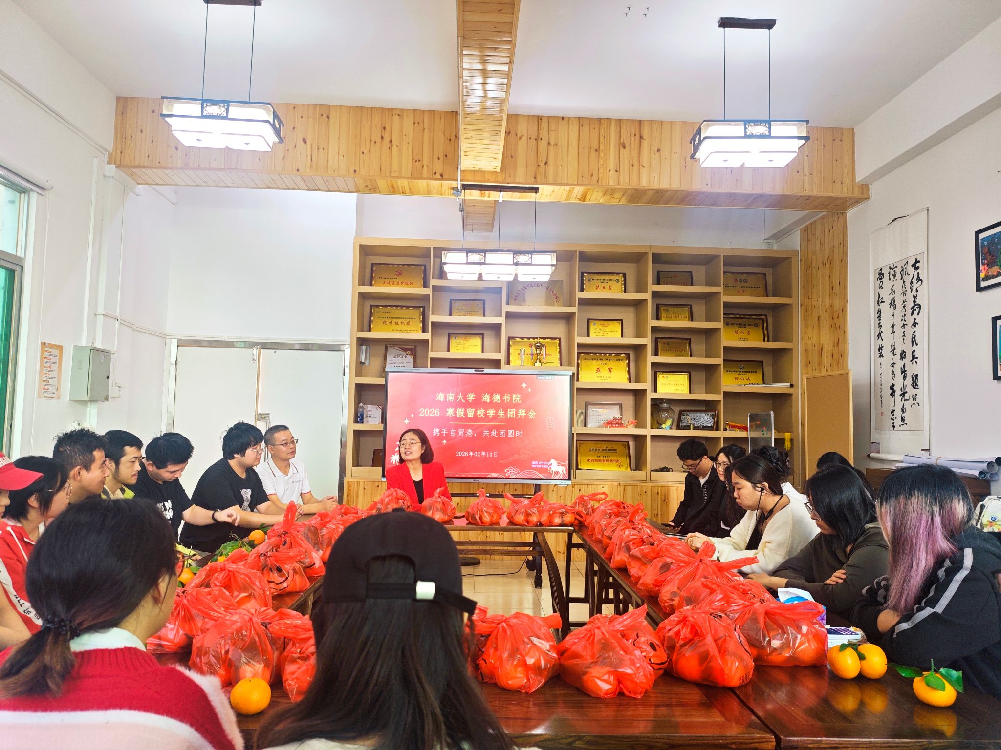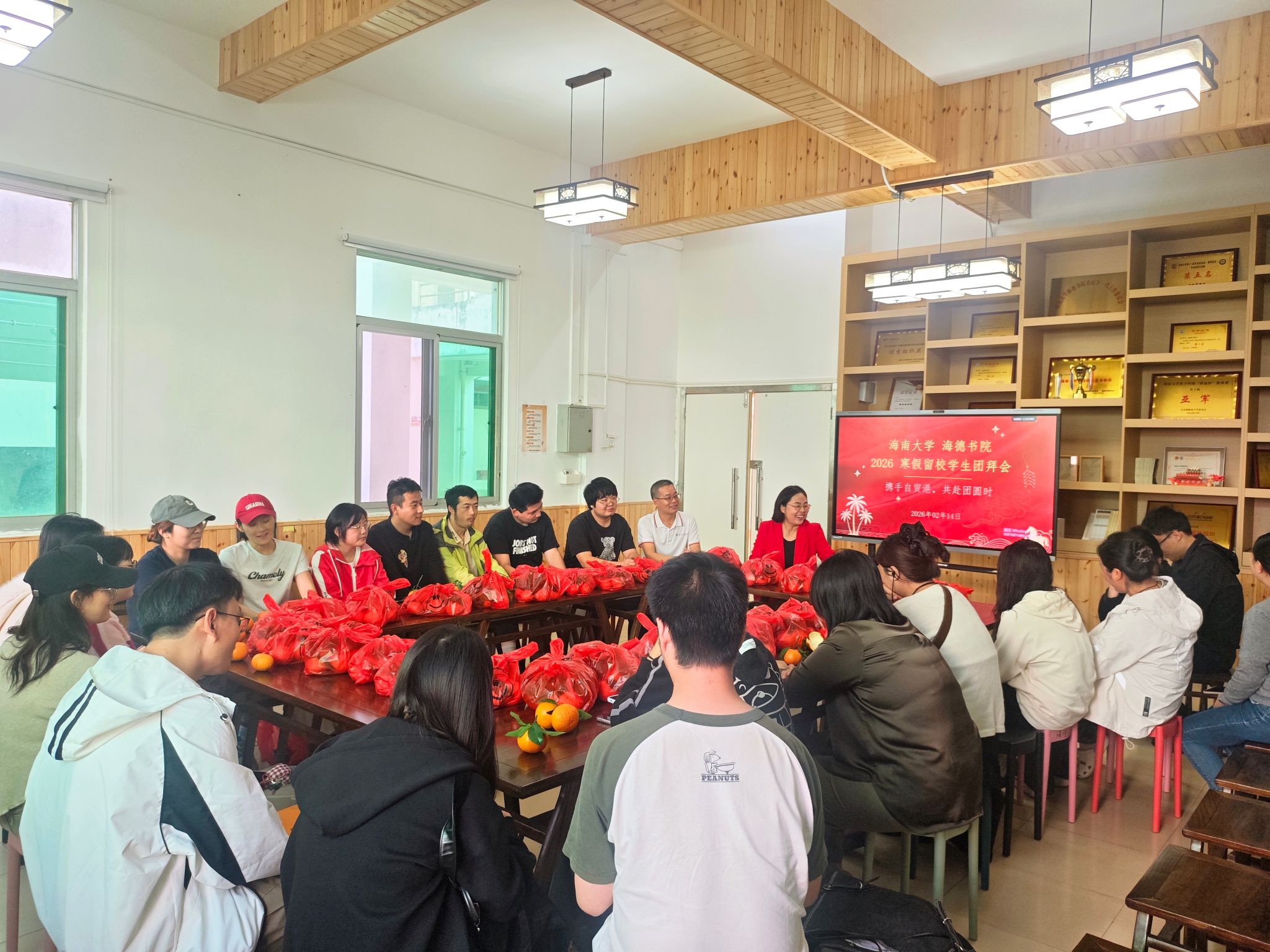 2026年2月14日,农历马年春节来临之际,海德书院学生公寓12号楼1楼会议室暖意融融,2026年留校学生新春团拜会在此温馨举行。海德书院党委书记韩胜丁、陈坤峰老师与寒假留校的40余名学生欢聚一堂,共迎新春,共话佳节。