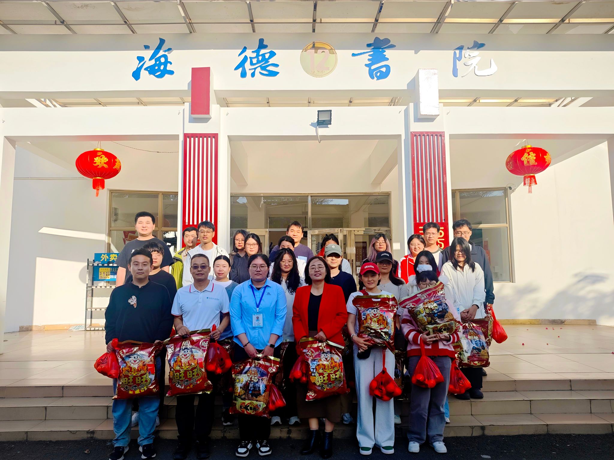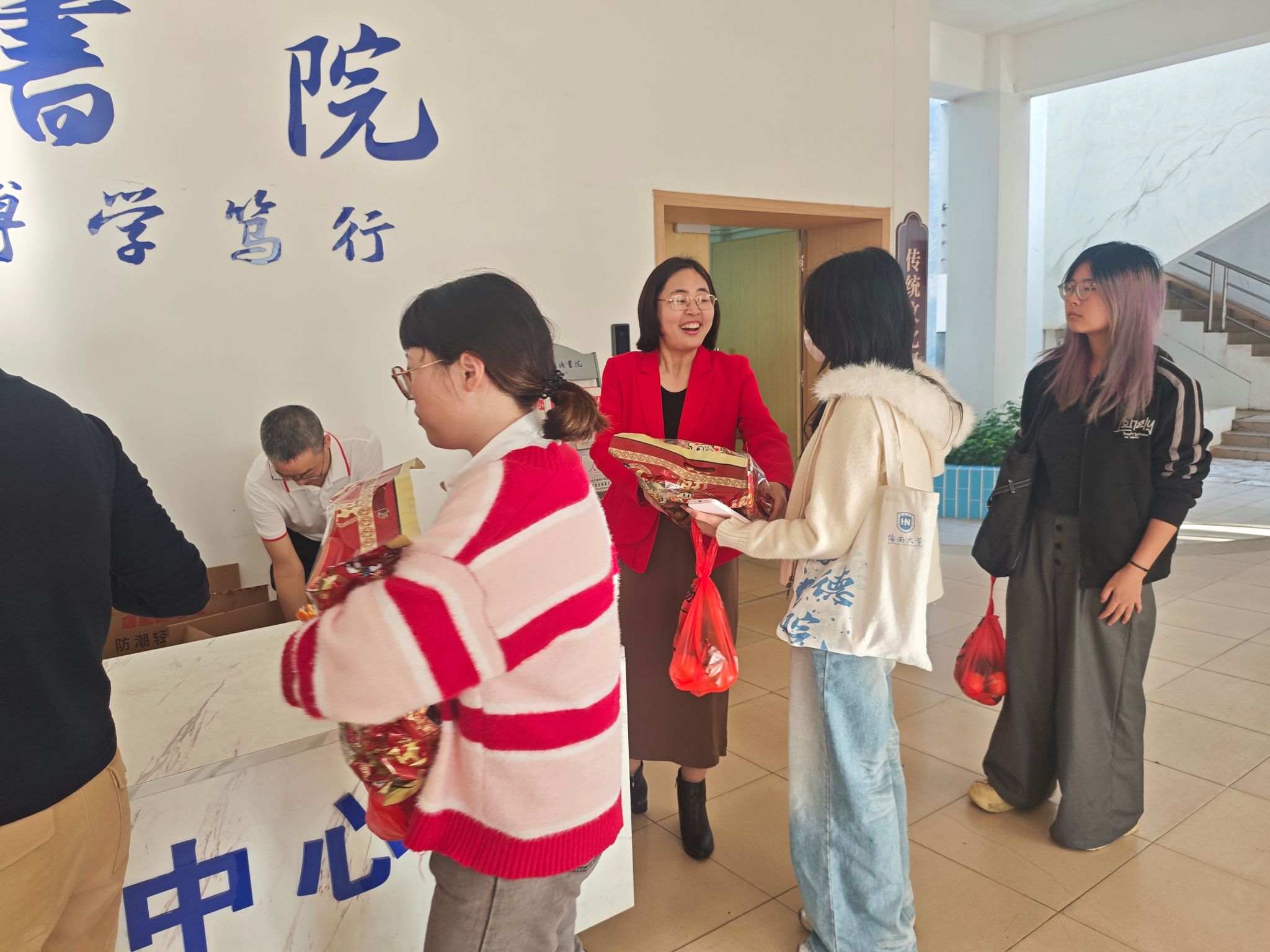 随后,韩胜丁书记为留校学生送上了精心准备的新春慰问大礼包——红火的旺旺大礼包和寓意吉祥的柑橘水果。这不仅承载着书院对学子们身体健康的祝愿,更传递着“大吉大利”的美好期许。接过慰问品,同学们脸上洋溢着幸福的笑容。