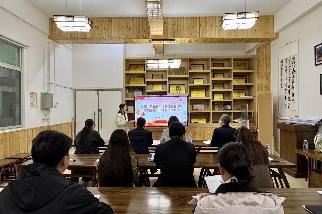 2026年1月22日上午,海南大学海德书院2025年度党组织书记抓基层党建工作述职评议考核会议在12栋一楼会议室顺利召开。海德书院党委书记韩胜丁、党委副书记崔建兵、学工办主任高雯、综合办主任陈坤峰,辅导员芦怡睿、王松锐、李雨函、余姜浩以及各党支部书记参会。