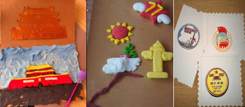 黏土画区,围绕红旗、党徽等元素创作具象作品。