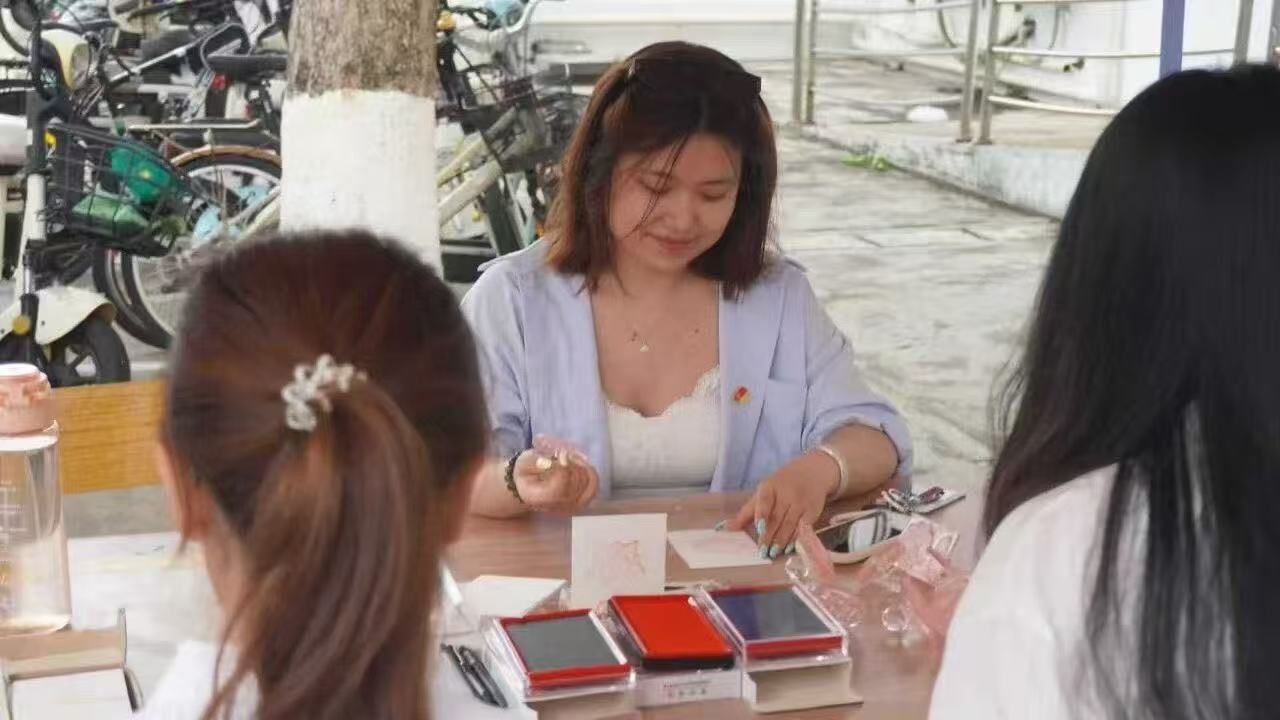 书签制作区,书法协会现场书写“不忘初心”“传承琼崖”等正能量词句。