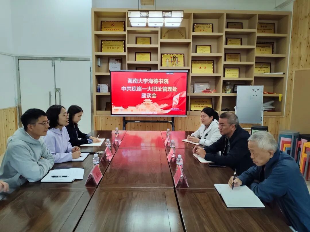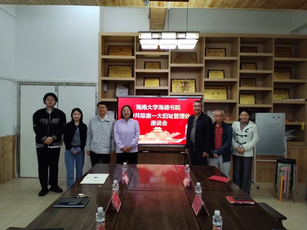 为深化校地协同,传承红色基因,2026年3月10日上午,海南大学海德书院与中共琼崖一大旧址管理处在12栋一楼会议室召开座谈会。管理处主任陈鸿辉、副主任王亚雄以及讲解员许阳威,海德书院党委书记韩胜丁、副书记崔建兵、辅导员王松锐及学生代表参会。