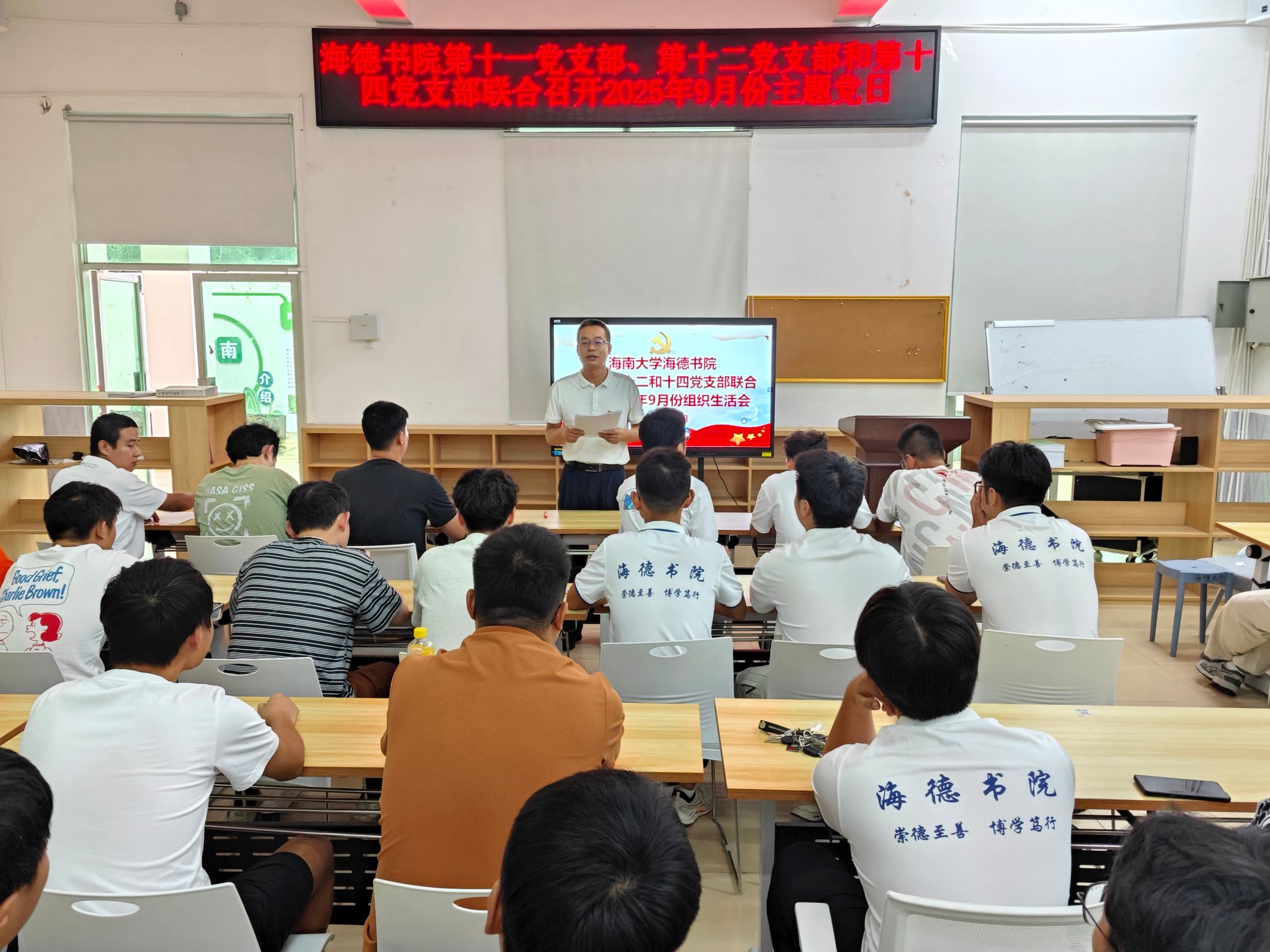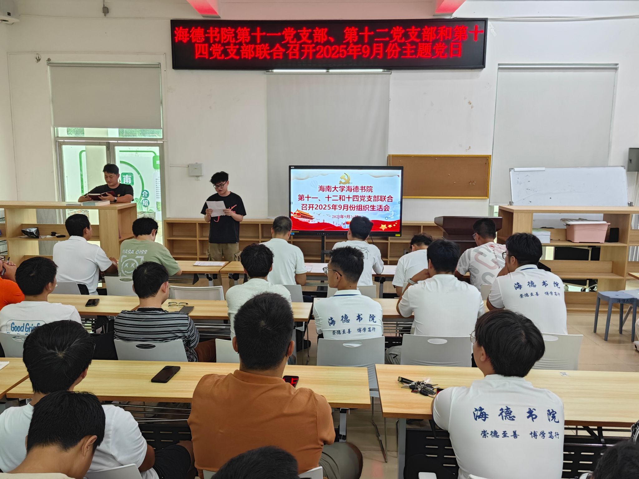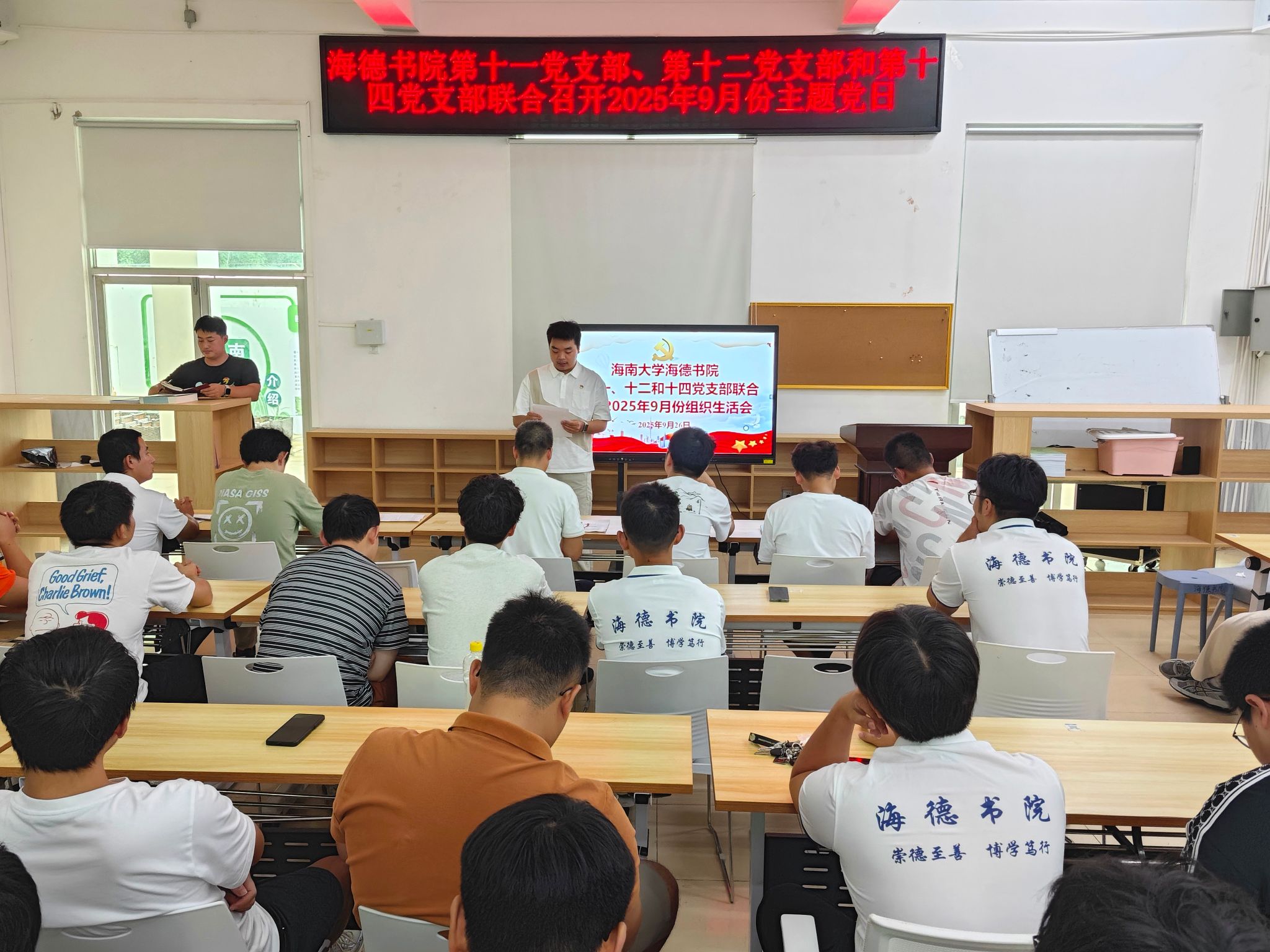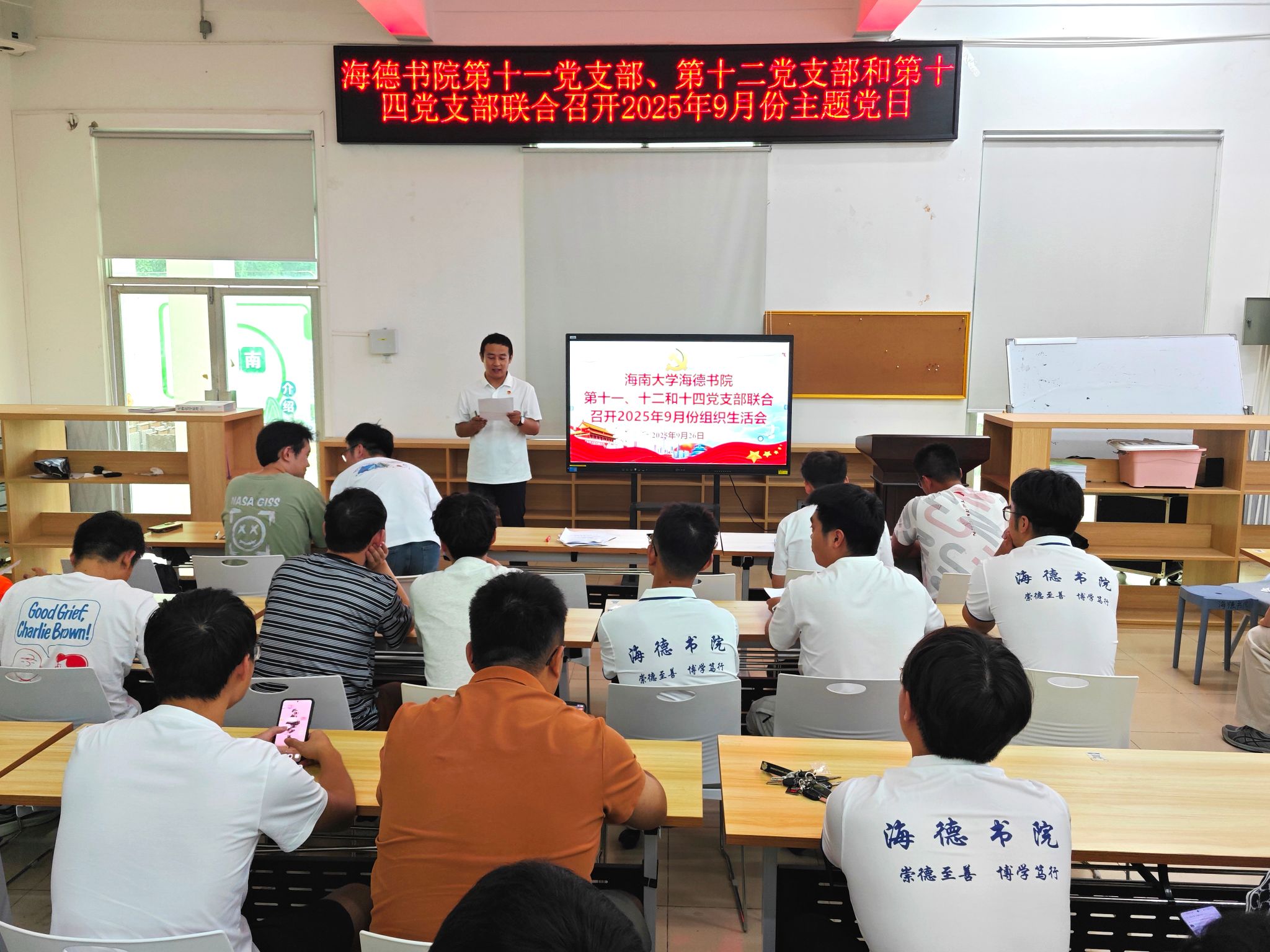 为深入贯彻落实学校党委组织部《海南大学2025年9月基层党建工作要点》精神,持续加强基层党组织建设,不断提升党员的政治理论素养和纪律规矩意识,2025年9月26日,海德书院第十一、第十二和第十四党支部在12栋2楼会议室联合召开了主题党日活动。三个支部的全体党员、发展对象及入党积极分子参加了会议。