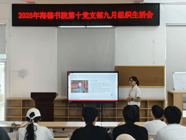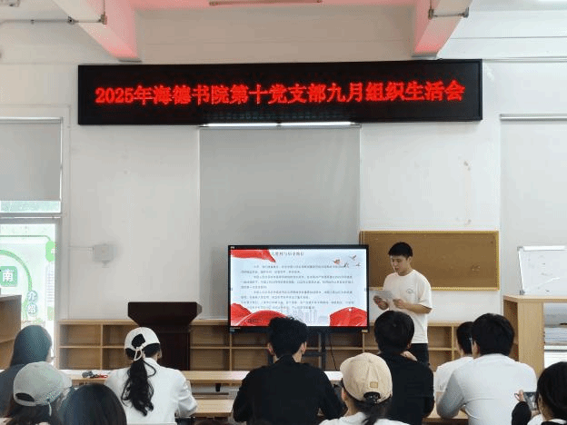 2025年9月23日,海德书院第十党支部在12栋二楼会议室召开2025年第三季度党员大会,会议由副书记吕翔主持,支部书记王松锐、全体党员及积极分子参会。本次会议分为党支部学习教育总结大会与党支部支委换届大会两部分进行。