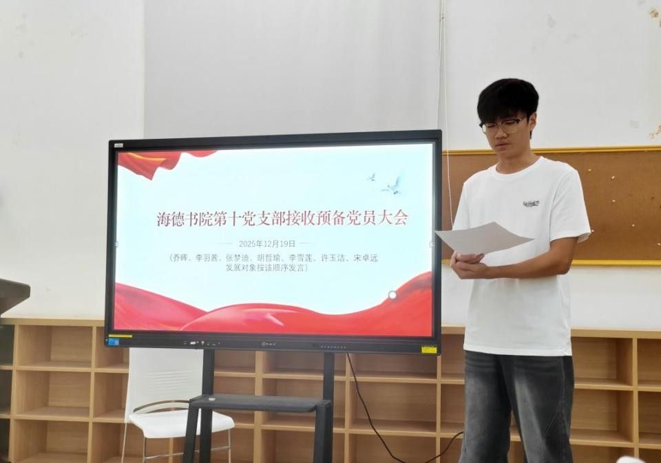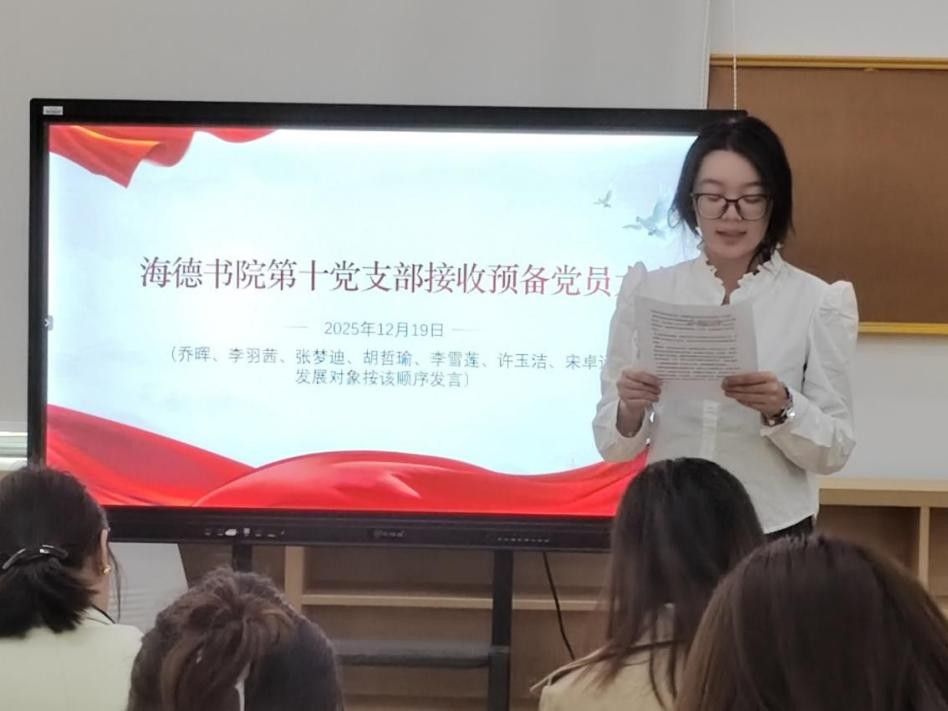 2025年12月19日,海德书院第十党支部在12栋二楼会议室召开2025年下半年接收预备党员大会。会议由王希婕同志主持,全体党员参会。