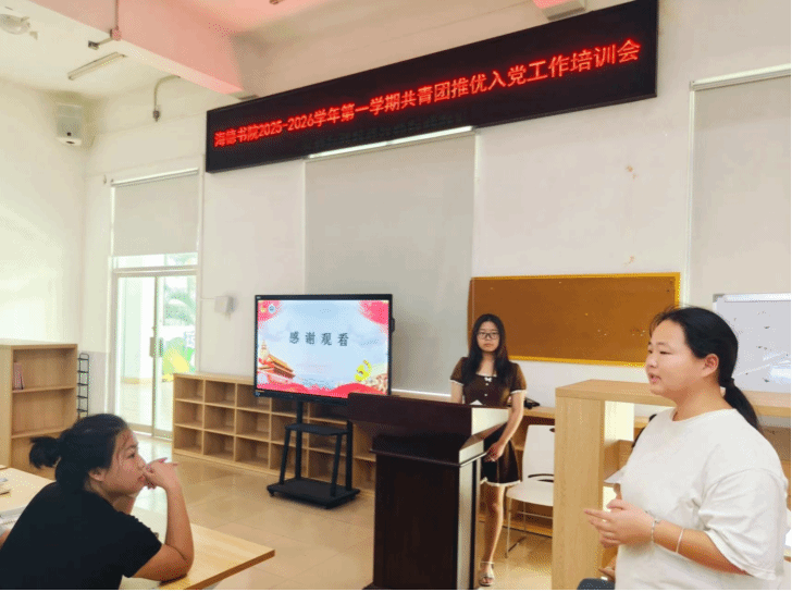 为规范党员发展程序,确保为党组织输送政治坚定、素质优良的后备人才,海德书院于10月17日在12栋二楼共享空间举行2025-2026学年第一学期共青团推优入党工作培训会。培训由书院团委组织部部长刘凌芷主讲,全体团支部书记参加。