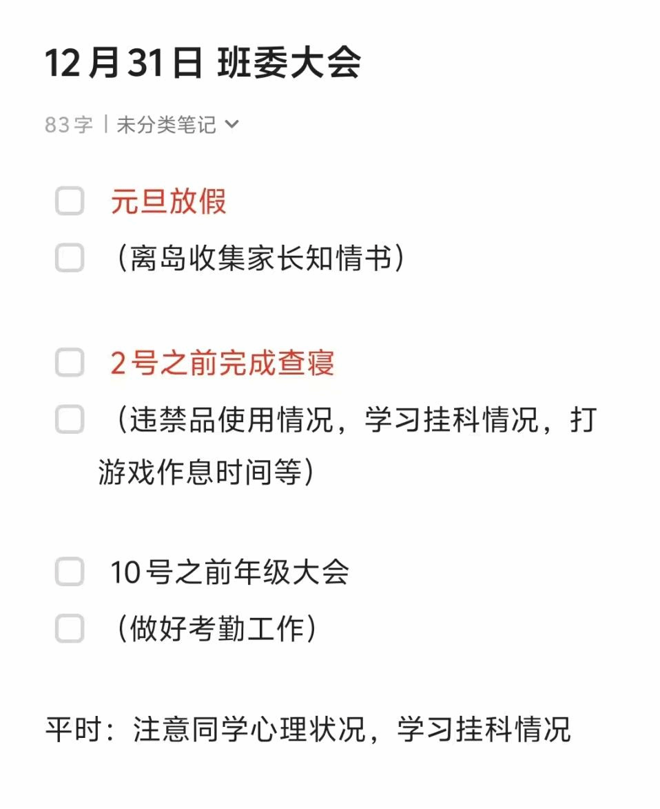 会议伊始,王老师首先就元旦假期安全工作作部署。强调全体班委需切实履行“第一道防线”职责,逐一传达假期安全要求:出行方面,提醒同学如有离校需求,需进行行程报备,同时注意在外人身安全;宿舍安全方面,离校前务必排查用电隐患,严禁使用违规电器;在网络安全方面,警示同学们网络非法外之地,注意自我言论。